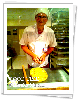 とても気さくな感じの男性が生地を成形中だったので、ガラス越しに撮影OKかとジェスチャー。